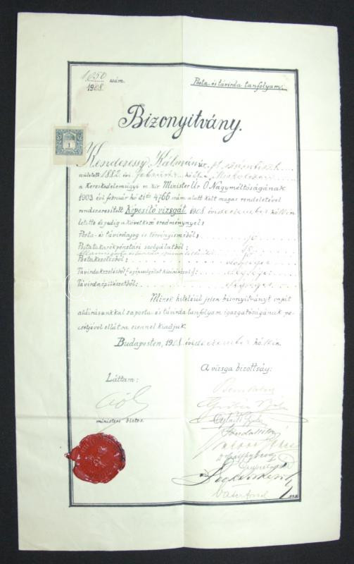 Posta és távírdai tanfolyam bizonyítványa postai viaszpecséttel https://www.darabanth.com/de/152-Fernauktion/152.0/Andere-Sammelgebiete/Dokument~224/Posta-es-tavirdai-tanfolyam-bizonyitvanya-postai-viaszpecsettel~II470197