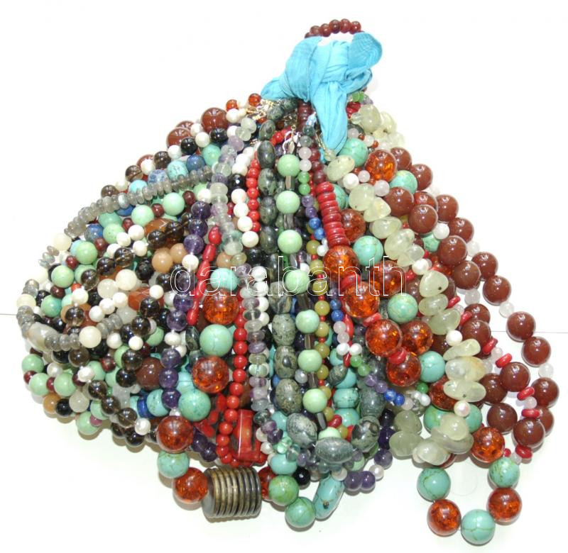 32db klf féldrágakő nyaklánc: korall, türkiz, lápisz lazuli, füstkvarc, achát, borostyán, karneol, ónix, gyöngyök, stb.