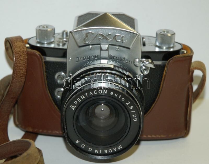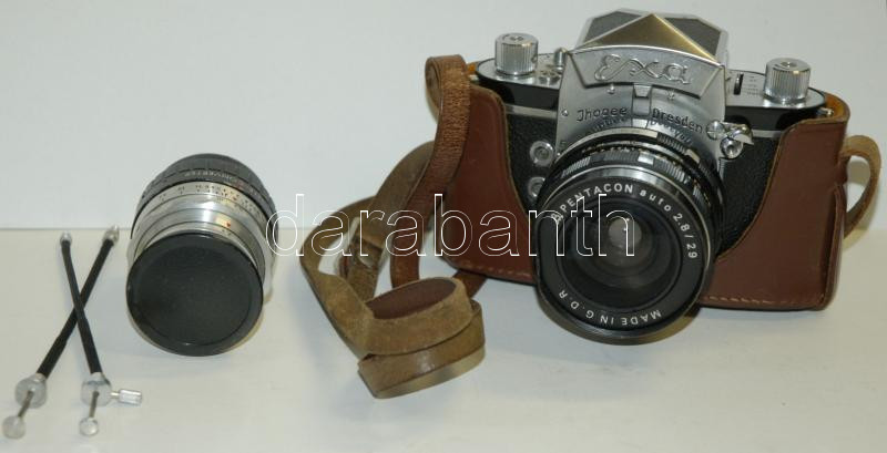 Exa típusú régi fényképezőgép objektívvel, 2db távkioldóval + szovjet fénymérő szerkezet (egy darab 29 mm-es nagylátószövű objektív, egy darab 50 mm-es normál objektív és egy darab fókusztávolságot kétszerező adapter.)