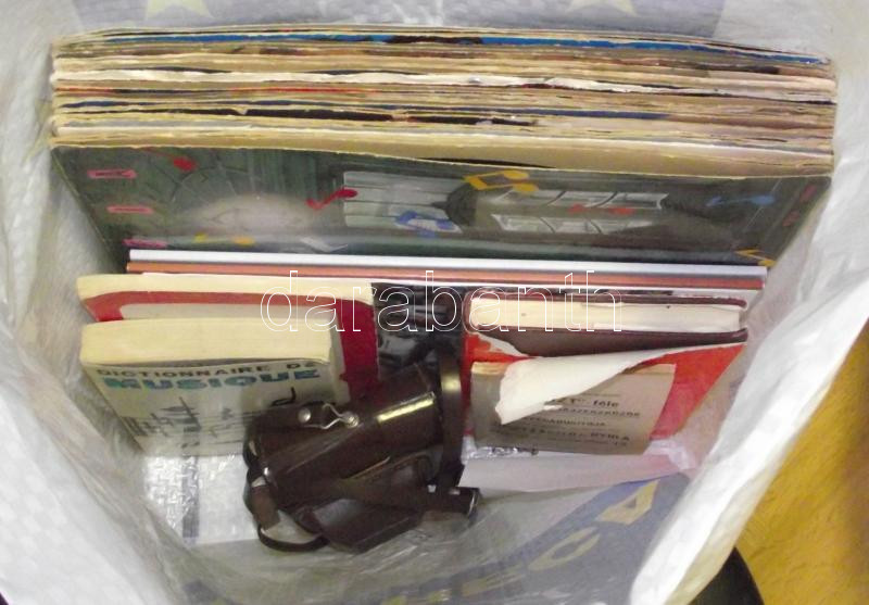 Nagy bolha tétel: 11db női és férfi karóra (mechanikus és kvarc), 1db ruhla márkájú férfi zsebóra, 1db Szmena márkájú fényképezőgép tokkal, 14db klf bakelit lemez, 7db klf témájú könyv, katalógus, folyóirat