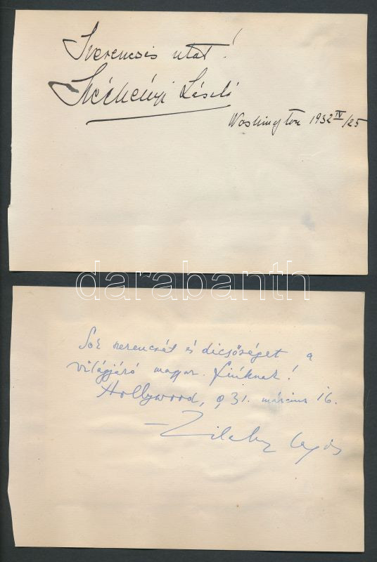1931 Aláírások és fotók Bartha Gyula és Sulkowky Zoltán gyűjteményéből: Zilahy Lajos író aláírt dedikáló sorai, Széchényi László aláírása és fotója, Magyar Sándor aláírása és fotója 3 füzetlapon.