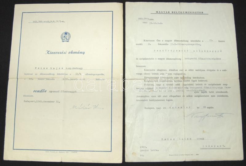Beschreibung: 1945-1957 Rendőr szolgálati iratai, kettő darabon Nagy Imre és Kádár János belügyminiszterek aláírásaival