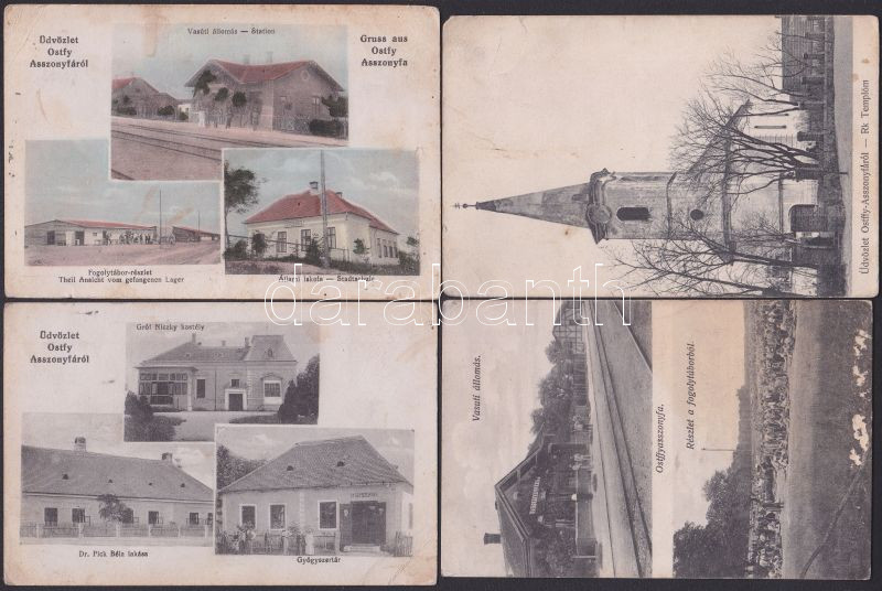 Beschreibung: Ostffyasszonyfa - 4 db háború előtti lap érdekes témákkal (vasútállomás, üzlet, fogolytábor), vegyes minőség