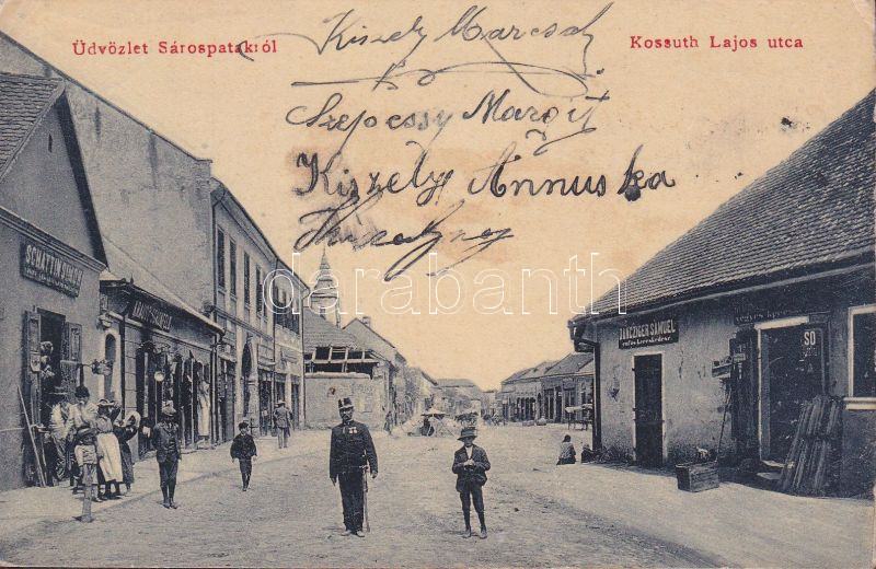 Sárospatak Kossuth Lajos utca Schattin Simon, Krausz Schönfeld üzletei... https://www.darabanth.com/de/152-Fernauktion/152.0/Ansichtskarten/Ungarn~500005/Sarospatak-Kossuth-Lajos-utca-Schattin-Simon-Krausz-Schonfeld-uzletei-es-Dancziger-Samuel-rof~II471728