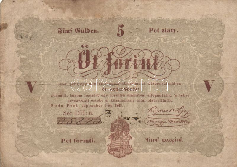 1848. 5Ft "Kossuth bankó" barna T:III https://www.darabanth.com/de/152-Fernauktion/152.0/Numismatik/Ungarische-Banknoten~700010/1848-5Ft-Kossuth-banko-barna-TIII~II468610