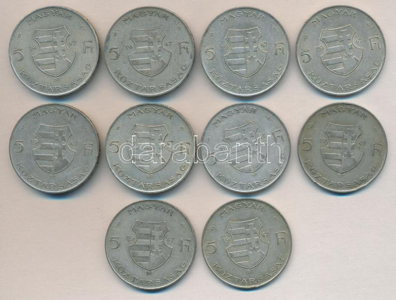1947. 5Ft Ag "Kossuth" (10x) T:vegyes https://www.darabanth.com/de/152-Fernauktion/152.0/Numismatik/Ungarische-Munzen~700011/1947-5Ft-Ag-Kossuth-10x-Tvegyes~II471640