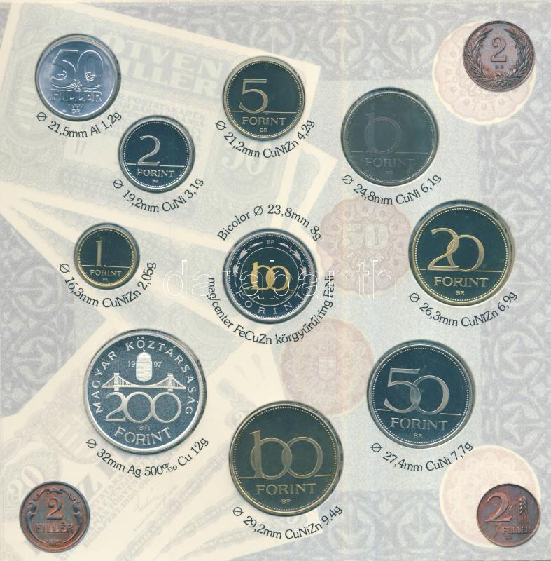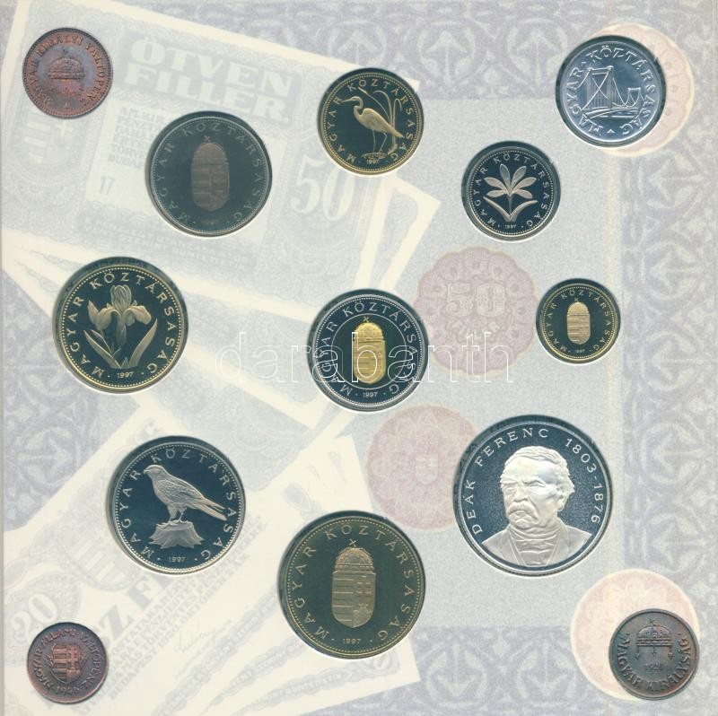 1997. 50f-200Ft 10klf db, benne 200Ft Ag "Deák", szettben T:PP Csak 30... https://www.darabanth.com/de/152-Fernauktion/152.0/Numismatik/Ungarische-Munzen~700011/1997-50f-200Ft-10klf-db-benne-200Ft-Ag-Deak-szettben-TPP-Csak-3000db~II467754