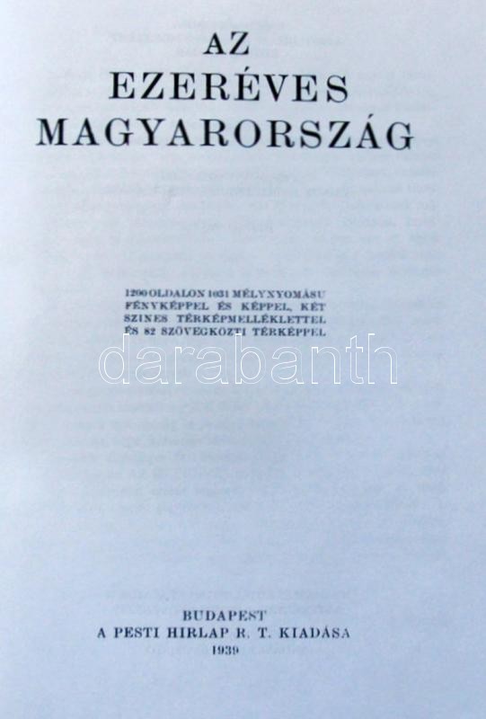 1939 Az ezeréves Magyarország, 1031 mélynyomású fényképpel és képpel, két színes térképmelléklettel és 82 szövegközti térképpel. Bp, 1939 Pesti Hirlap 1200p. Reprint kiadás. (hibátlan állapotban)