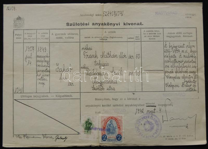 1942 Születési anyakönyvi kivonat Nagyvárad városi okmánybélyeg + 1P i... https://www.darabanth.com/de/153-Fernauktion/153.0/Andere-Sammelgebiete/Dokument~500004/1942-Szuletesi-anyakonyvi-kivonat-Nagyvarad-varosi-okmanybelyeg-plus-1P-illetekbelyeg-vegyes-l~II476501