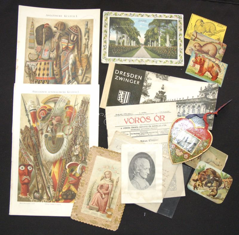 Beschreibung: Kis vegyes hagyaték okmány és nyomtatvány hagyaték, benne 1800-as viaszpecsétes levél, rajz, képeslapfüzet, egyéb. Össz. kb 20 db