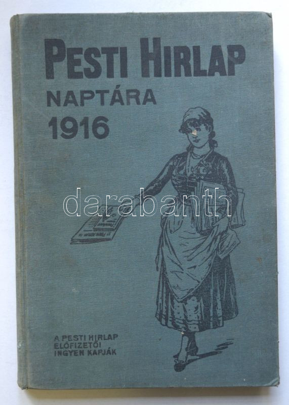 1916 A Pesti hírlap naptára. Festett egészvászon kötés https://www.darabanth.com/de/153-Fernauktion/153.0/Andere-Sammelgebiete/Drucksachen~500016/1916-A-Pesti-hirlap-naptara-Festett-egeszvaszon-kotes~II460902