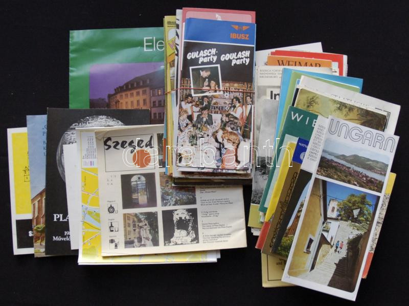 Beschreibung: 77db magyar és külföldi utazási prospektus, idegenforgalmi szórólapok, 1 térkép és 2 egyéb prospektus