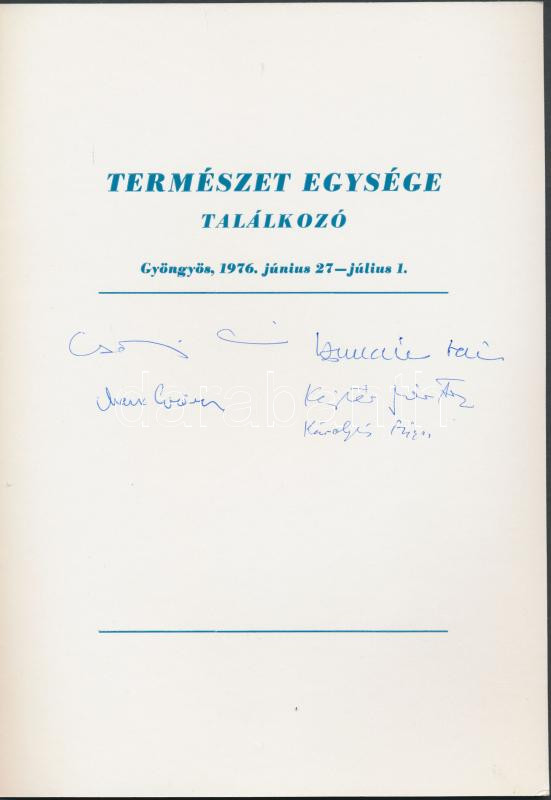 1976 Természet egysége találkozó emléklap tudósok aláírásával: Csányi Vilmos biológus, Marx György atomfizikus, Kajtár Márton kémikus, Károlyházi Frigyes fizikus