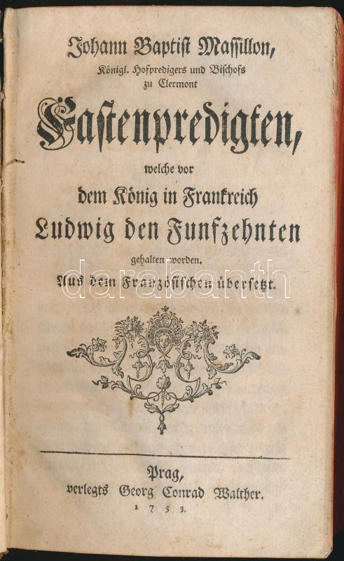 Massillon, Johann Baptist: Fastenpredigten, welche vor dem Könige in Frankreich Ludwig dem fünfzehnten gehalten worden. Prag 1754. Georg Walther. BOrdázott egészbőr kötésben, szép állapotban / In full leather binding. Nice condition 420p.