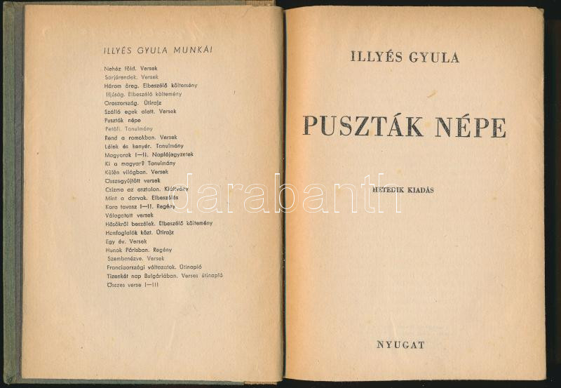 1948 Illés Gyula: Puszták népe, Nyugat Kiadó. Bp., kiadói félvászon kö... https://www.darabanth.com/de/154-Fernauktion/154.0/Ansichtskarten/Bucher-Sonstige-Raritaten~6000227/1948-Illes-Gyula-Pusztak-nepe-Nyugat-Kiado-Bp-kiadoi-felvaszon-kotesben-jo-allapotb~II453268