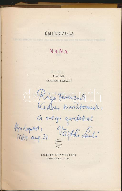 Emile Zola: Nana, Európa Kiadó, Bp. 1961, A fordító, Vajthoó László de... https://www.darabanth.com/de/154-Fernauktion/154.0/Ansichtskarten/Bucher-Sonstige-Raritaten~6000227/Emile-Zola-Nana-Europa-Kiado-Bp-1961-A-fordito-Vajthoo-Laszlo-dedikalasaval~II481560