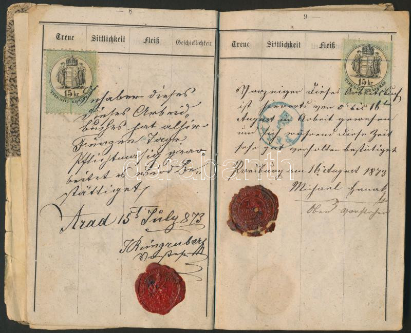 Beschreibung: 1871 Inas munkakönyve sok cseh és magyar bejegyzéssel, viaszpecséttel / Work-book with many entries