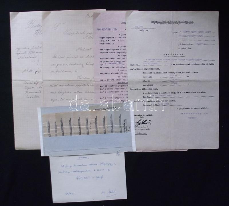 Belépőjegyek és engedélyek a hárshegyi cserkészparkba, illetve tarkaest megtartására az 1940-es évekből + 1924-1950 16db régi magyar nyomtatvány - értesítő, postai feladóvevény, sörcímke, stb. + Emléklapok és dokumentumok Váci György könyvkötőmester munkájáról, saját kezű aláírásaival