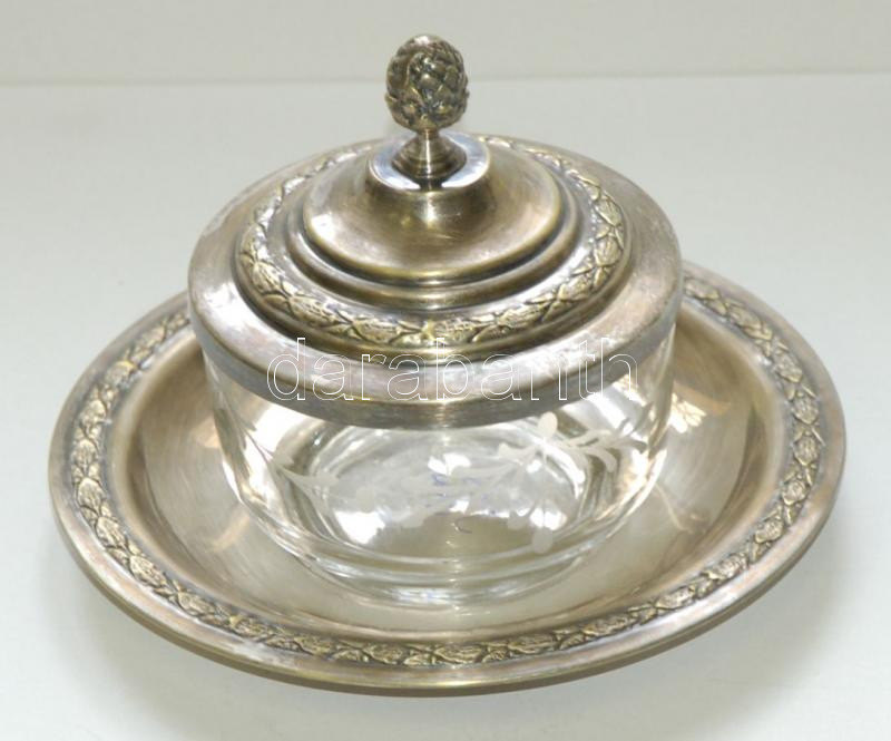 Beschreibung: Ezüstözött cukorkás üvegtál fém tányérral
