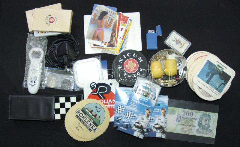 Beschreibung: Kis bolhapiac tétel: beszélő sörnyitó, kártya, zsebszámológépek, uti sakk, söralátétek, stb.