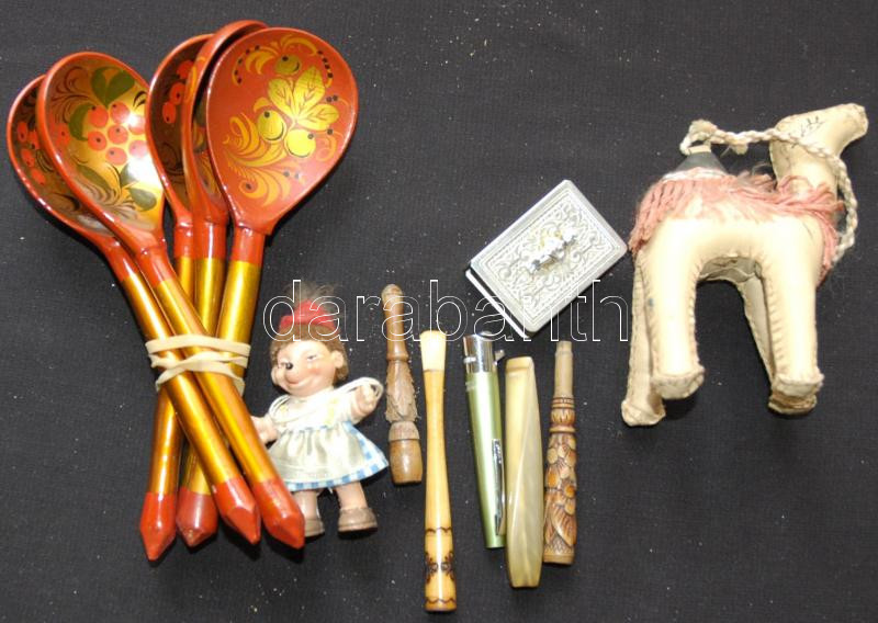 Beschreibung: Kis bolhapiac tétel: lakkozott fakanalak, kis NDK sün figura, bőr teve figura, szipkák, öngyújtó
