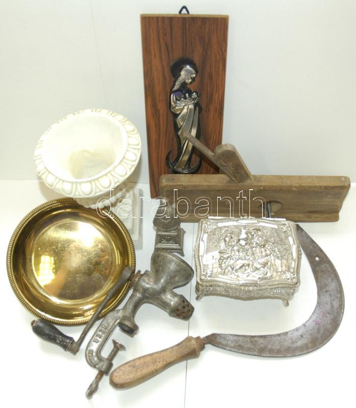 Beschreibung: Vegyes bolha tétel: gipsz váza, gyalu, ékszeres ládika, sarló, stb.