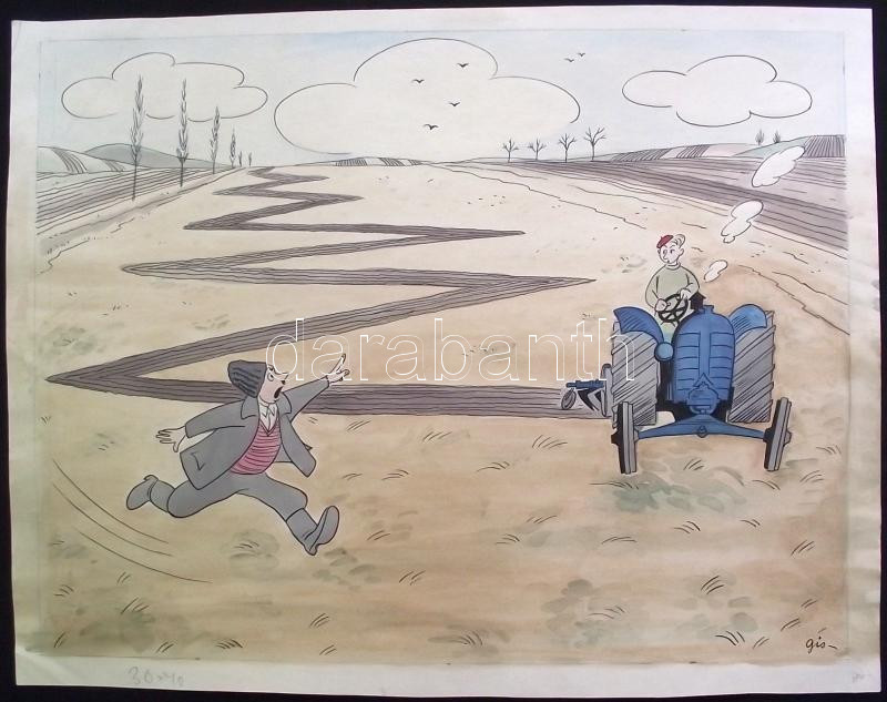 Beschreibung: Szegő Gizi: "Állj meg Jancsi, ha már tegnap a kocsmában nem álltál meg 2 fröccs után". Vegyes technika, papír, jelzett 42x33 cm
