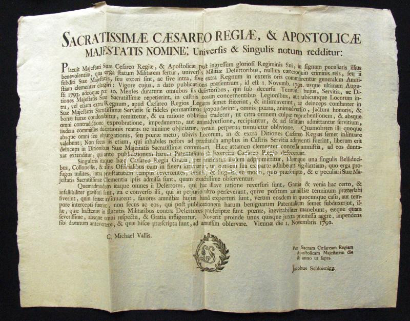 Beschreibung: 1792 Katonaszökevények részére adott közkegyelem hirdetménye latin nyelven / General-amnesty for deserted soldiers in Latin. 43x37 cm