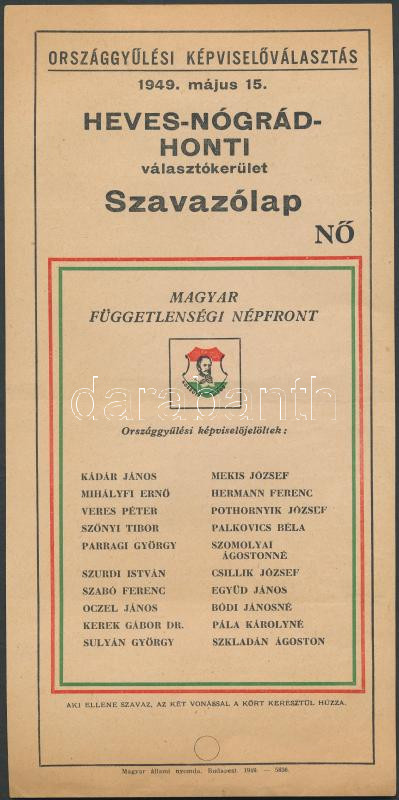 1949 Országgyűlési választás Függetlenségi népfront női szavazólap. Nó... https://www.darabanth.com/de/154-Fernauktion/154.0/Ansichtskarten/Historische-Dokumenten-Handschriften~6000209/1949-Orszaggyulesi-valasztas-Fuggetlensegi-nepfront-noi-szavazolap-Nograd-Hont-megye~II478598