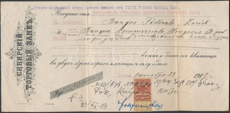Beschreibung: 1917/1918 2db pénzutalási bizonylat hadifogoly részére magyar-orosz nyelven a Szibériai Kereskedelmi Bank és a Pesti Magyar Kereskedelmi Bank közt