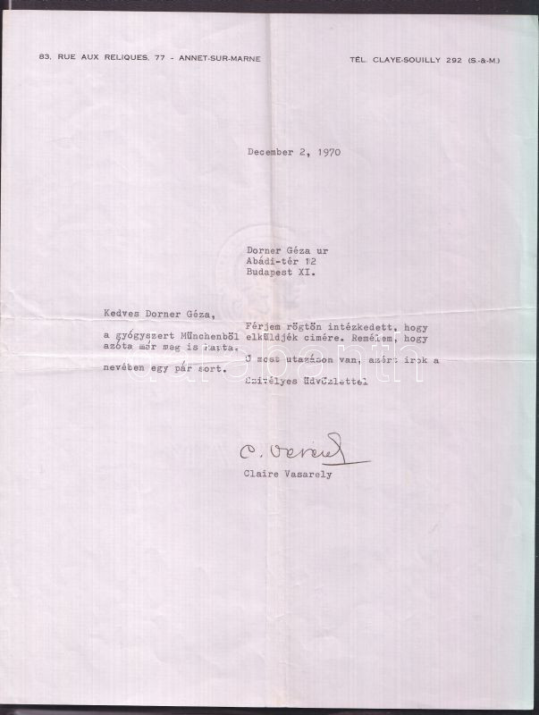 1970 Claire Vasarely által aláírt levél, melyben férje helyett segítséget ígér külföldi gyógyszer beszerzésében magyar barátjuknak. Hozzá: a segítő által írt levél