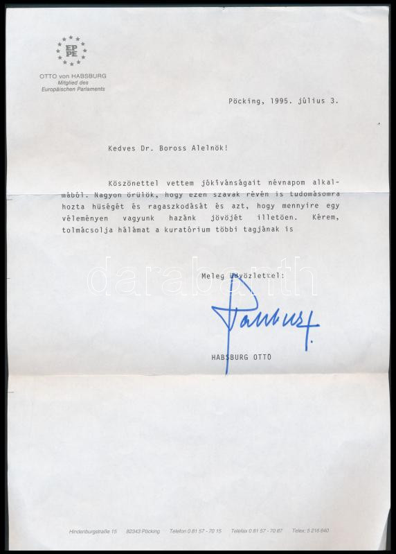 Beschreibung: 1994 Habsburg Ottó saját kezű aláírása levélen / Signature of Otto Habsburg