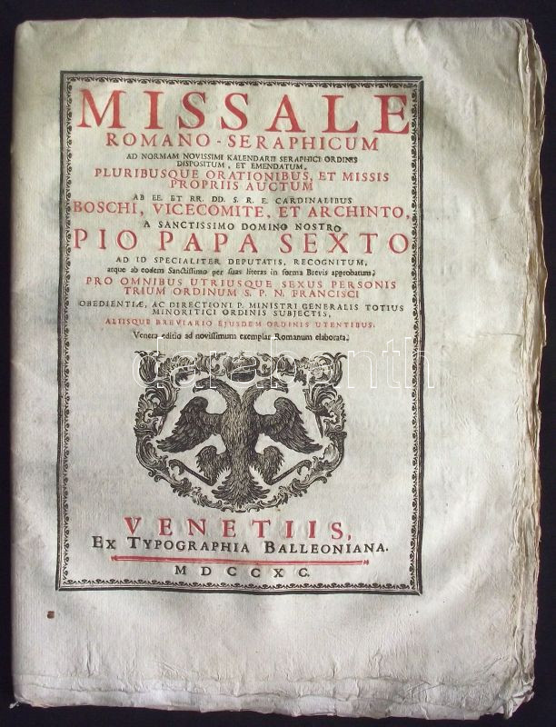 Missale Romano-Seraphicum... Venetiis, ex typograohia Balleoniana, 1790 Latin nyelvű Velencében nyomtatott nagyméretű misekönyv felvágatlanul, szép állapotban / Latin mass-book in nice condition 56p