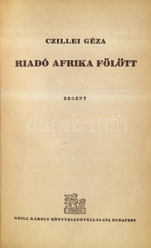Czillei Géza: Riadó Afrika fölött. Bp., é.n. Grill Károly. Sérült gerincű egészvászon kötésben.