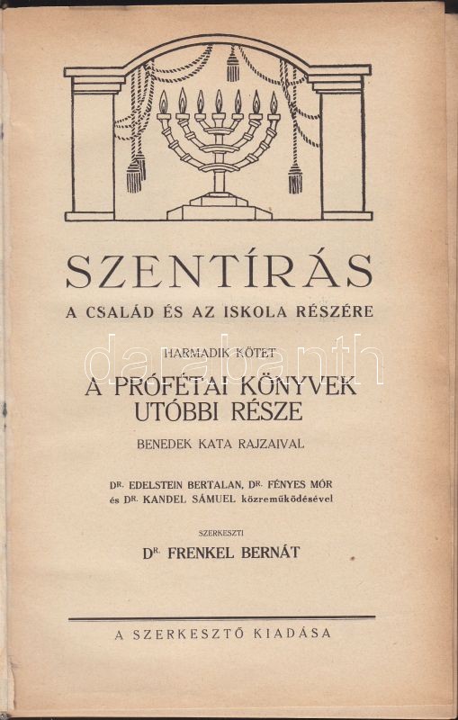 Szentírás a család és az iskola részére. Szerk. Frenkel Bernát. 3. A prófétai könyvek, Benedek Kata rajzaival, szerzői kiadás, aranyozott egészvászon kötésben (gerincen sérülés)