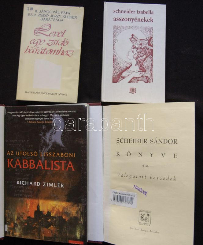 Beschreibung: 4db klf judaika témájú könyv: Levél egy zsidó barátomhoz, Asszonyénekek, Scheiber Sándor könyve, Az utolsó Liszaboni kabbalista