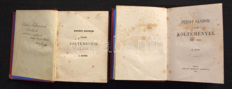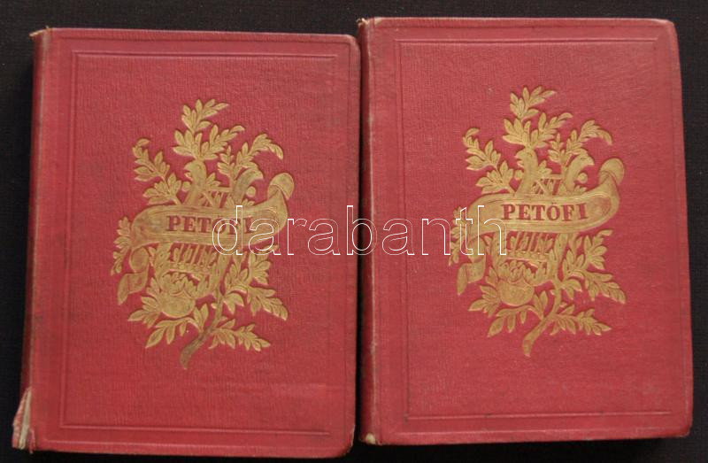 Petőfi Sándor ujabb költeményei. 1847-1849. I-II kötet. Pest, 1858. Emich Gusztáv, eredeti aranyozott vaknyomott egészvászon kötésben, festett lapszélekkel (első kötet gerince sérült, de egyébként szép állapotban)