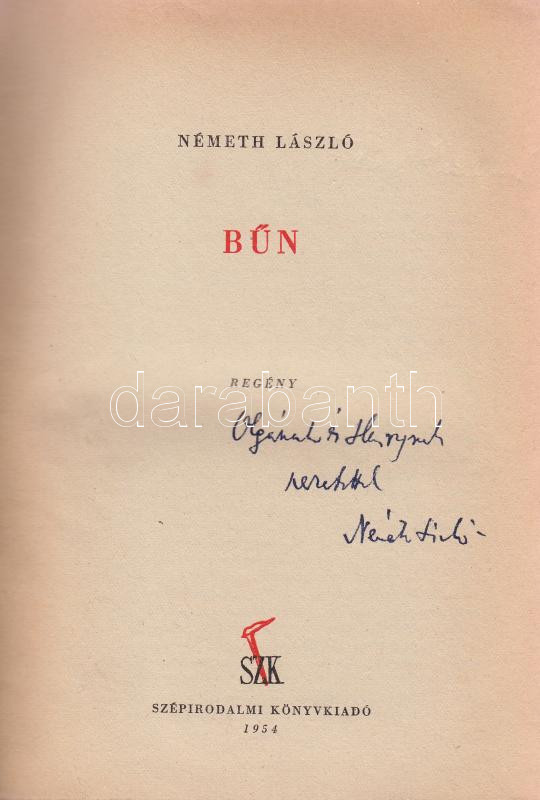 1954 Németh László: Bűn, Szépirodalmi Könyvkiadó, Bp., kiadói félvászo... https://www.darabanth.com/de/155-Fernauktion/155.0/Andere-Sammelgebiete/Bucher-Sonstige-Raritaten~5000362/1954-Nemeth-Laszlo-Bun-Szepirodalmi-Konyvkiado-Bp-kiadoi-felvaszon-kotesben-megvis~II484736