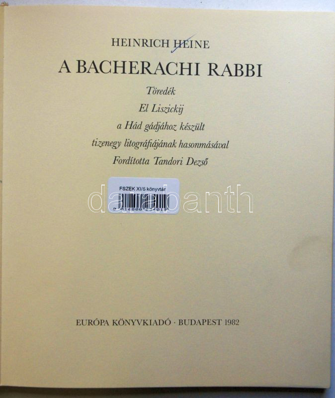 1982 Heinrich Heine: A Bacherachi rabbi - Töredék El Liszickij a Hád gádjához készült tizenegy litográfiájának hasonmásával, Európa Könyvkiadó Bp., kiadói egészvászon kötésben