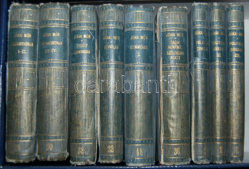 Jókai Mór sorozat összesen 9 kötet kiadói, festett dombornyomott, aran... https://www.darabanth.com/de/155-Fernauktion/155.0/Andere-Sammelgebiete/Bucher-Sonstige-Raritaten~5000362/Jokai-Mor-sorozat-osszesen-9-kotet-kiadoi-festett-dombornyomott-aranyozott-sorozatkotesben~II433342