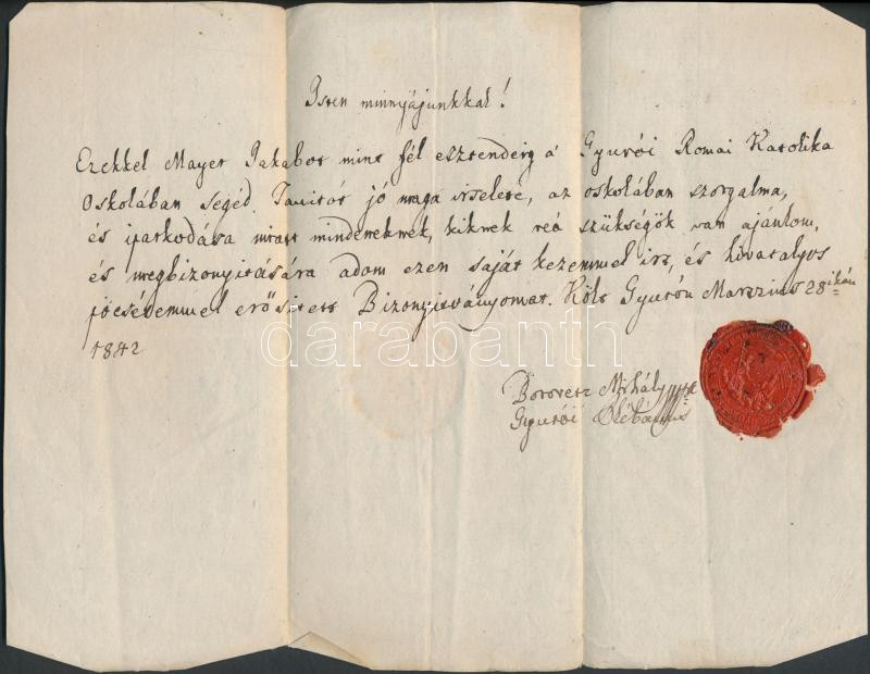 Beschreibung: 1842 Borovetz Mihály gyúrói plébános Isten mindnyájunkkal felcímű igazolása segédtanító részére. Viaszpecséttel.