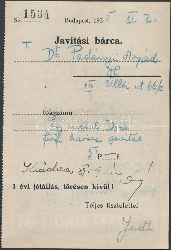 Bp. VIII. ker Dévai Jenő órás javítási bárcája https://www.darabanth.com/de/155-Fernauktion/155.0/Andere-Sammelgebiete/Dokument~5000309/Bp-VIII-ker-Devai-Jeno-oras-javitasi-barcaja~II486487
