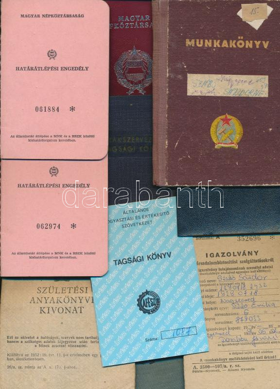 Kis igazolvány tétel: 1982 Magyar Népköztársasági fényképes útlevél, tagsági könyvek, születési anyakönyvi kivonat, munkakönyv, katonai igazolvány, stb.