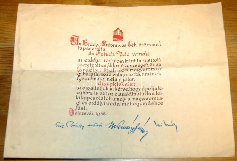 Beschreibung: 1938 Erdélyi Szépmíves Céh jubileumi díszoklevele 33x24cm