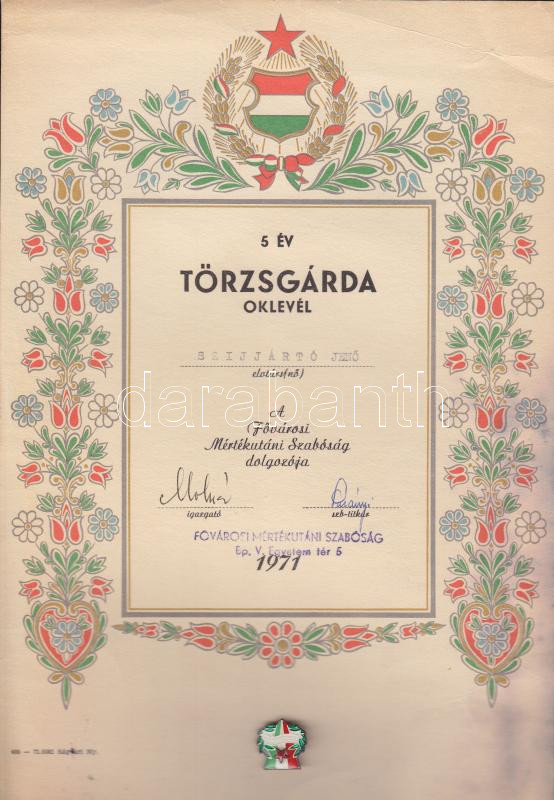 1971 Törzsgárda oklevél és jelvény https://www.darabanth.com/de/155-Fernauktion/155.0/Andere-Sammelgebiete/Drucksachen~5000322/1971-Torzsgarda-oklevel-es-jelveny~II436101