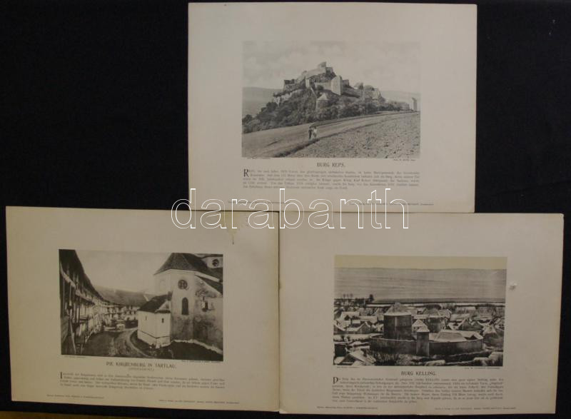 Beschreibung: 3db erdélyi várakról készült nyomat a nagyszebeni J. Drotleff nyomdájából 24x33cm