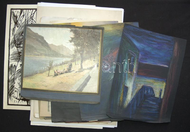 Nagy mennyiségű rajz, rézkarc, linómetszet, acélmetszet jegyzett alkotóktól, jó darabokkal valamint illusztrációk, hozzá nyomatok. Érdekes anyag, érdemes megnézni! Kb 100 db