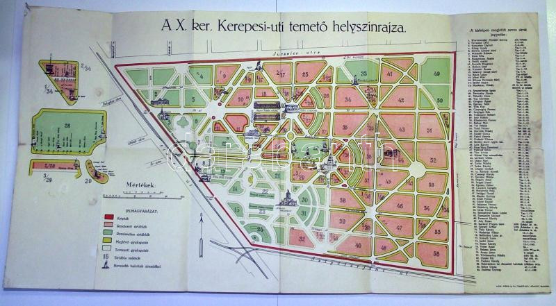 Beschreibung: cca 1900 A X. ker. Kerepesi temető helyszínrajza/térképe neves sírok jegyzékével. (kis hibával) 60x30 cm