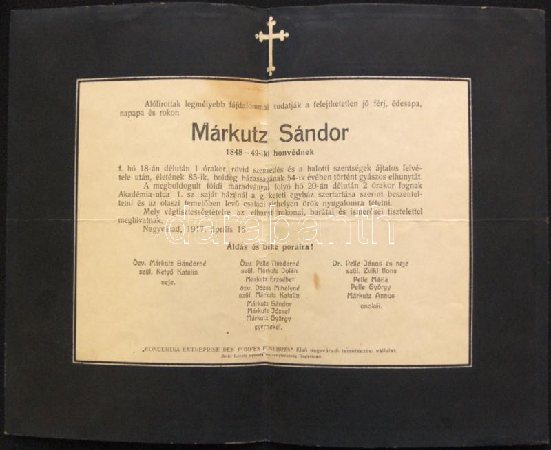 Beschreibung: Máőrkutz Sándor 1848-49-es honvéd gyászjelentése