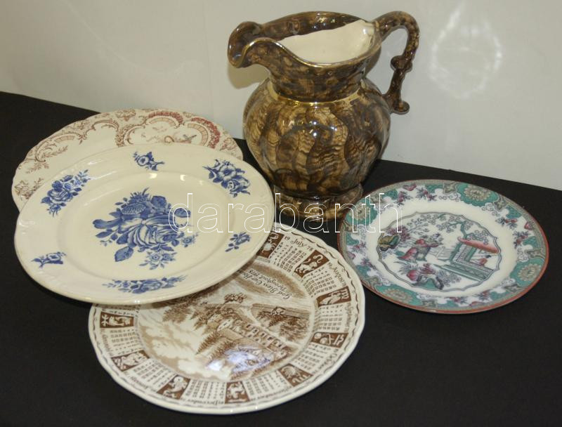 Beschreibung: 4db klf dekoratív porcelán tányér + 1db porcelán kacsó (törött, de javítva)
